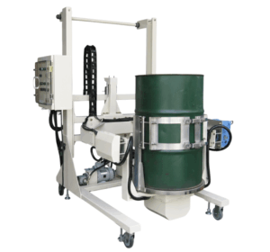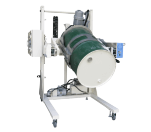 混合後のドラムを昇降・反転し、その場で原料の取り出しが可能